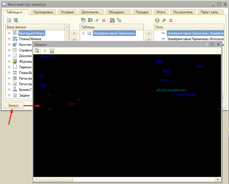 Контруктор запроса, черный фон в тектосом редакторе запроса