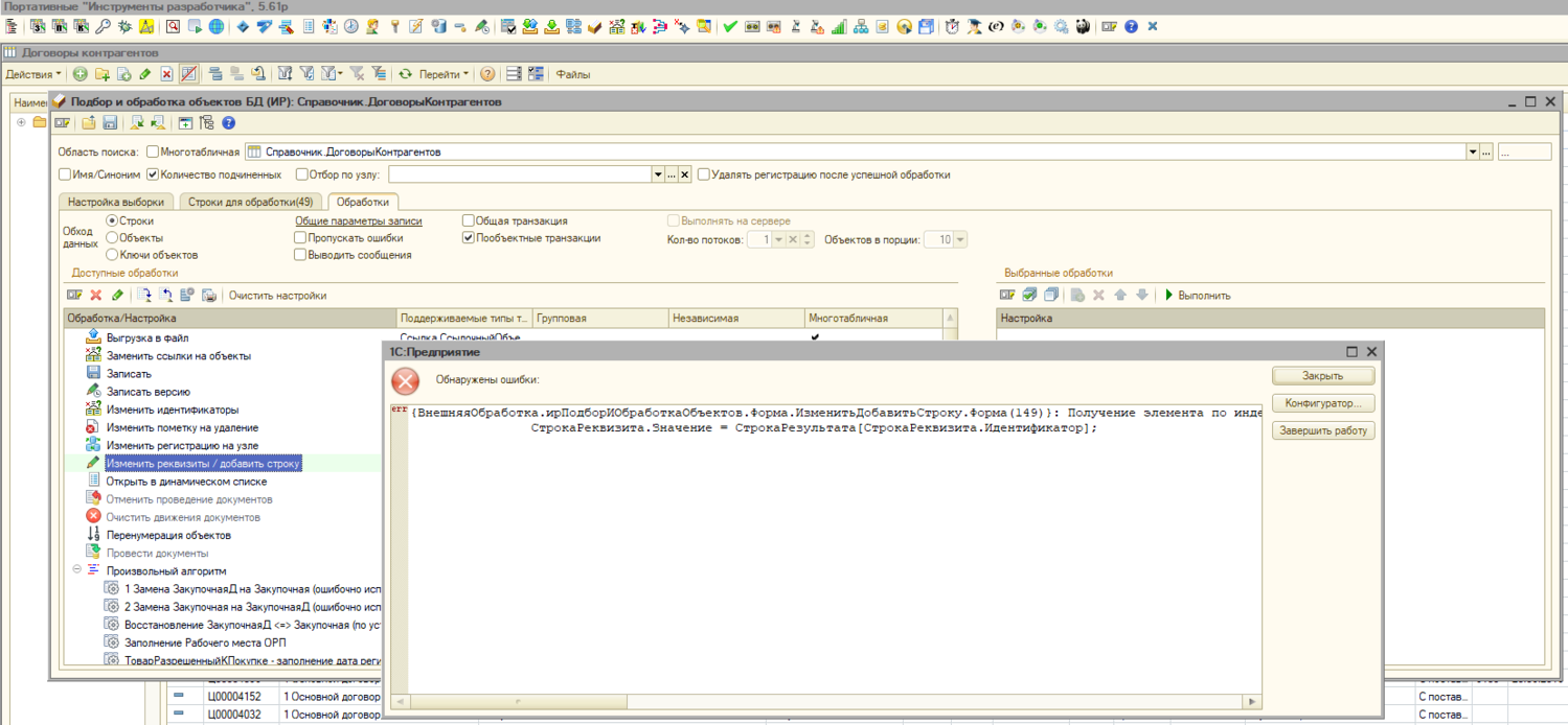 | 1. Сделал отбор договоров с незаполненным реквизитом 2. Выбрал опцию Изменить реквизиты, где указал заполнить 3. Выдало ошибку записи первого договора - увидел, что документ полностью пустой (все реквизиты пустые, возможно, когда-то давно, при переносе базы, перенесли пустую ссылку) 4. Зашёл в другом окне в список договоров и удалил их непосредственно 5. Вернулся в список договоров на заполнение и убрал галочки с тех, что удалил 6. Выбрал опцию Изменить реквизиты, где указал заполнить 7. Выскочила ошибка