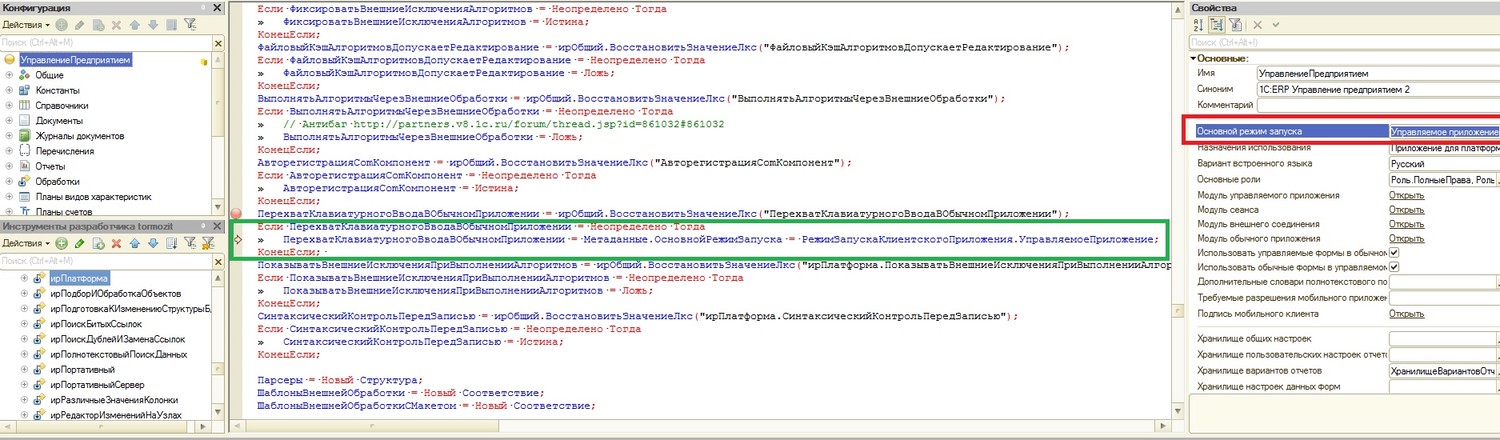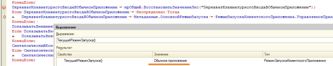 | На скриншотах точка останова на месте, где выставляется флаг использования перехвата в обычном приложении. Видно, что он принимает значение Истина, даже когда я запускаю расширение в обычном приложении о чем мне сообщается метод ТекущийРежимЗапуска(). Просто мне не понятно, если проблема наблюдается именно в режиме Обычного Приложения, то почему срабатывает перехват клавиатурного ввода? Или ты хочешь сказать, что при комбинации свойства конфигурации "Основной режим запуска = УправляемоеПриложение" + "Текущий режим запуска = Обычное приложение" проблемы с обновлением табличных частей при нажатии на клавиши не наблюдаются, когда включен перехват клавиатуры? Добавлено (30.05.2021, 21:33) --------------------------------------------- Всё, я понял, что ты на самом деле хотел сказать. Если пользователь работает с конфигурацией в Обычном Приложении (в УПП например), то из-за перехвата клавиатурного ввода в этих формах будут наблюдаться тормоза. Но если работают например уже в ERP, то тормоза будут наблюдаться только в обычных формах у Администратора, который запустил Обычное Приложение для запуска ИР. Но обычных форм в ERP почти нет, поэтому и влияния на производительность будет минимальное...