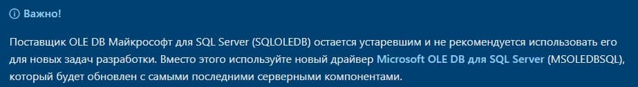 Поставщик OLE DB Майкрософт для SQL Server (SQLOLEDB) остается устаревшим и не рекомендуется использовать его для новых задач разработки. Вместо этого используйте новый драйвер Microsoft OLE DB для SQL Server (MSOLEDBSQL), который будет обновлен с самыми последними серверными компонентами.