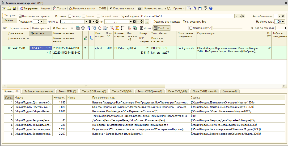 Собираем логи по базе  по событию DBPOSTGRS - SQL, PostgreSQL, плюс в логи попадают EXCP. В обработке Анализ техжурнала выполняю загрузку с галкой "Выполнять на сервере". в реквизите "Чужой журнал" выбрана папка для сбора журнала по бд. Пока логов было не много - все грузилось корректно.