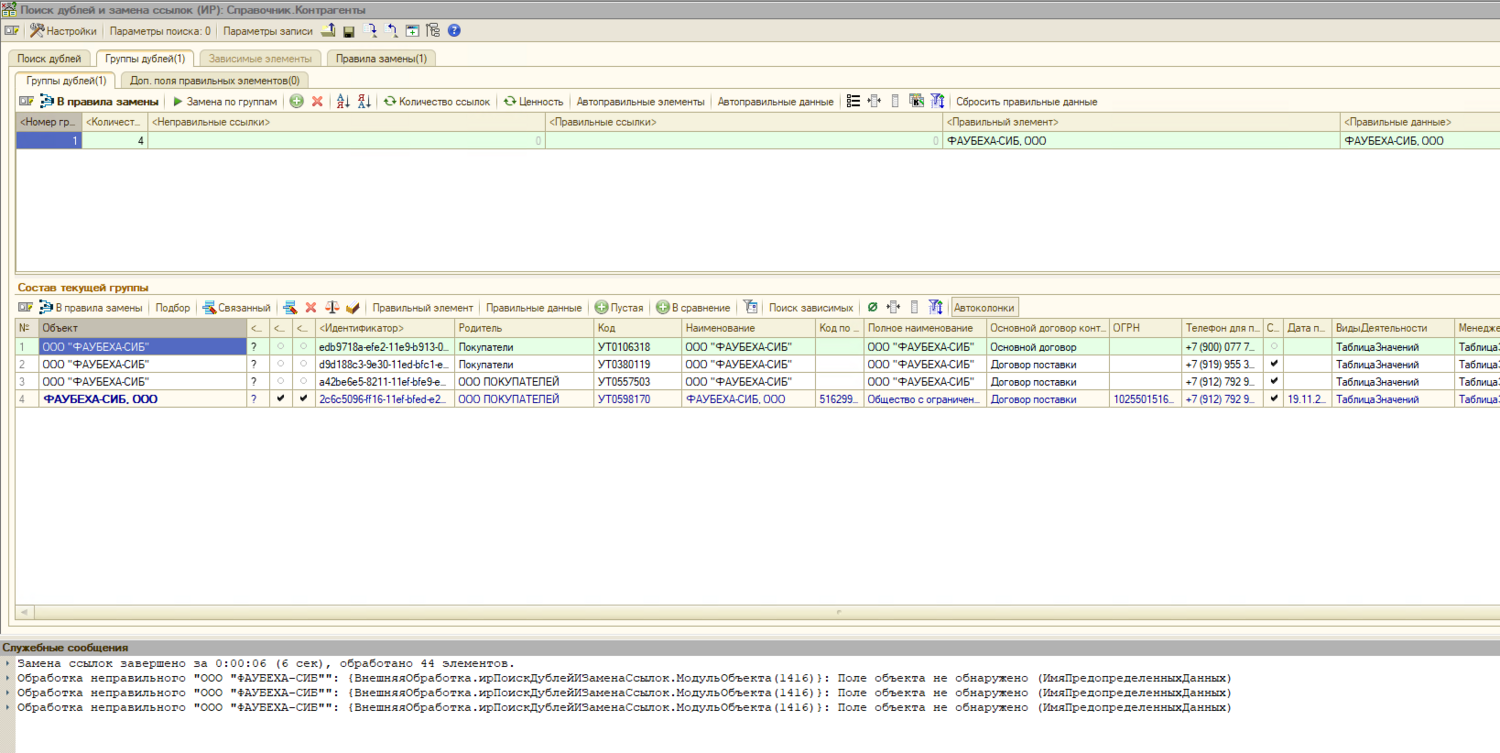 Обработка неправильного "ООО "ФАУБЕХА-СИБ"": {ВнешняяОбработка.ирПоискДублейИЗаменаСсылок.МодульОбъекта(1416)}: Поле объекта не обнаружено (ИмяПредопределенныхДанных)