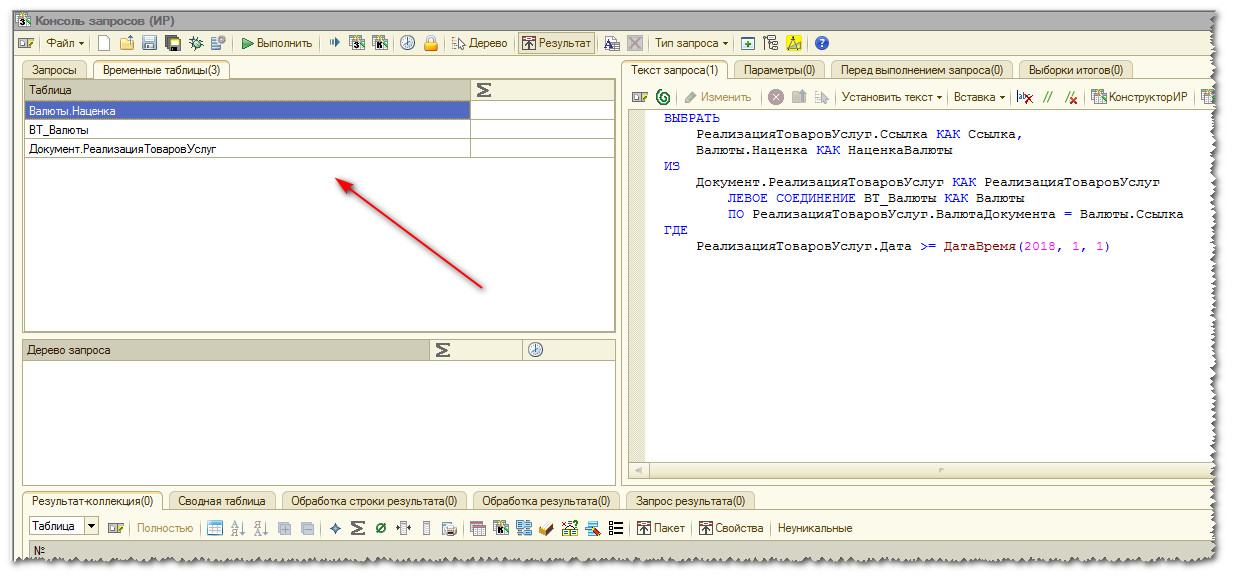 Код МенеджерВТ = Новый МенеджерВременныхТаблиц; Запрос = Новый Запрос; Запрос.МенеджерВременныхТаблиц = МенеджерВТ; Запрос.Текст = "ВЫБРАТЬ * |ПОМЕСТИТЬ ВТ_Валюты |ИЗ | Справочник.Валюты КАК Валюты"; Запрос.Выполнить(); Запрос.Текст = "ВЫБРАТЬ | РеализацияТоваровУслуг.Ссылка КАК Ссылка, | Валюты.Наценка КАК НаценкаВалюты |ИЗ | Документ.РеализацияТоваровУслуг КАК РеализацияТоваровУслуг | ЛЕВОЕ СОЕДИНЕНИЕ ВТ_Валюты КАК Валюты | ПО РеализацияТоваровУслуг.ВалютаДокумента = Валюты.Ссылка |ГДЕ | РеализацияТоваровУслуг.Дата >= ДатаВремя(2018, 1, 1)"; От(Запрос);