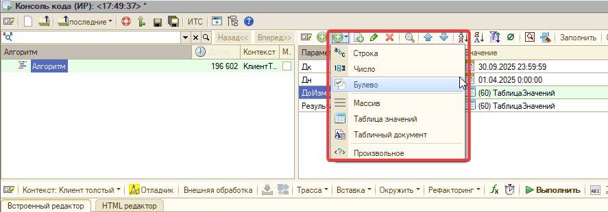 | В таком случае добавляй такой параметр обычным путем - через добавление строки и затем кнопку выбора типа в колонке "Значение". А в подменю размещены команды добавления параметров для часто используемых типов.